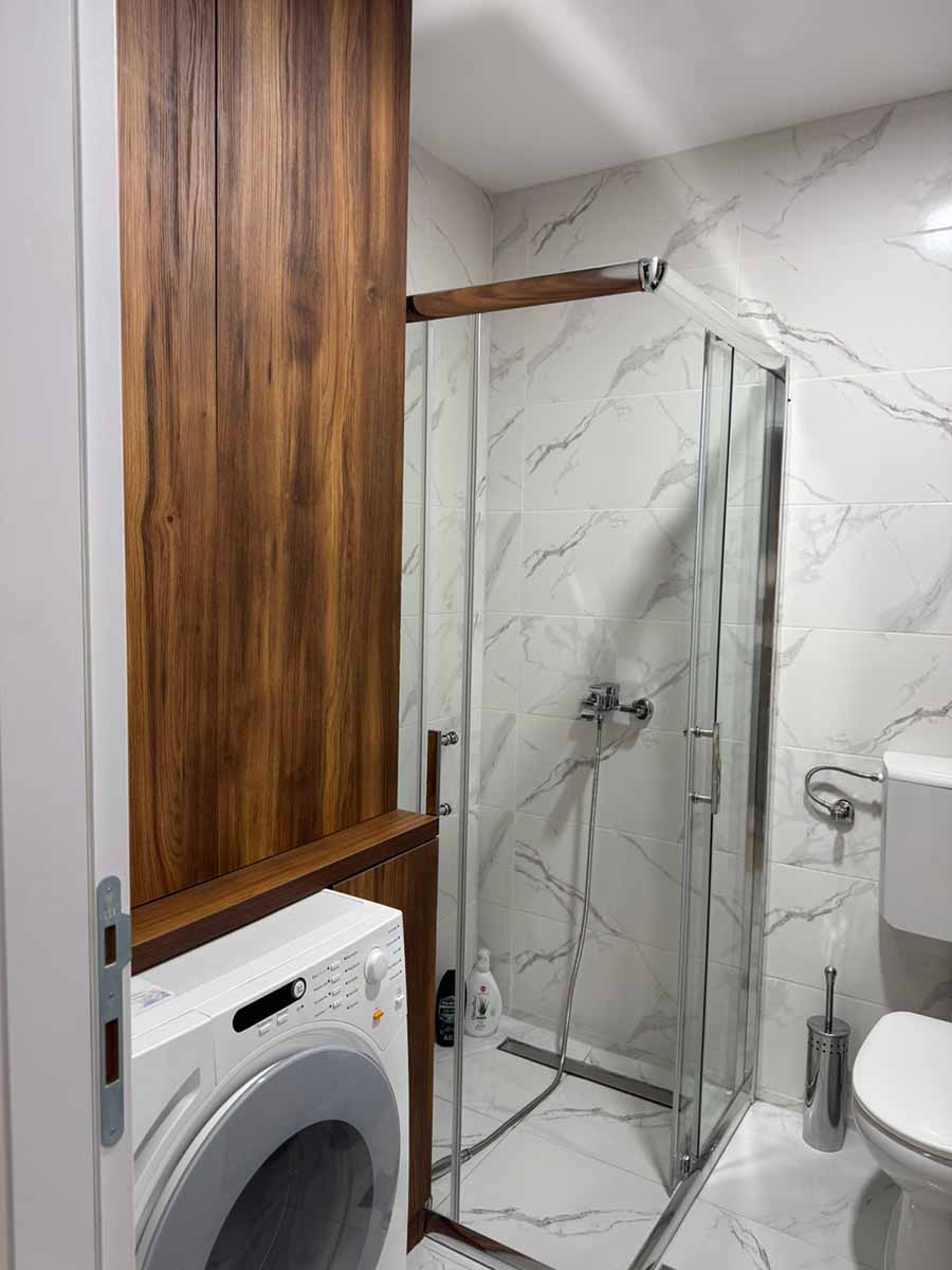Kupatilo je moderno, sa svim potrebnim detaljima za prijatan boravak, uključujući peškire i fen.